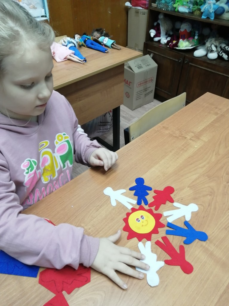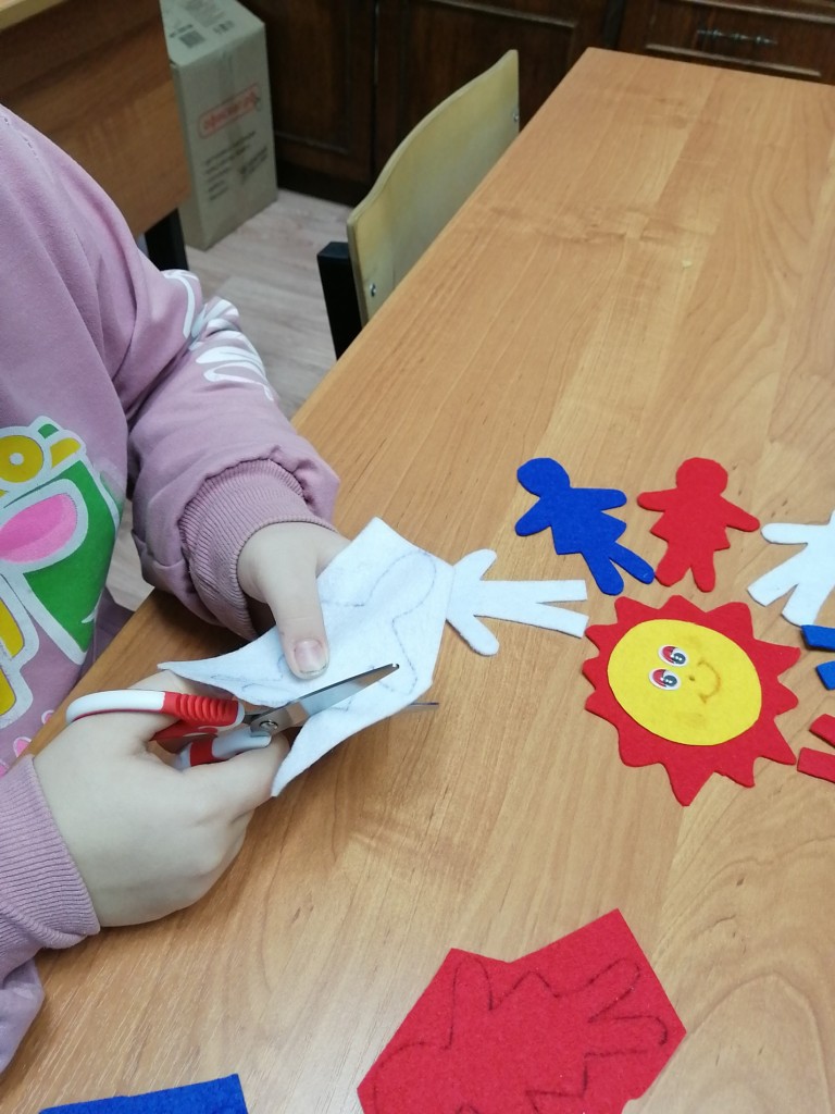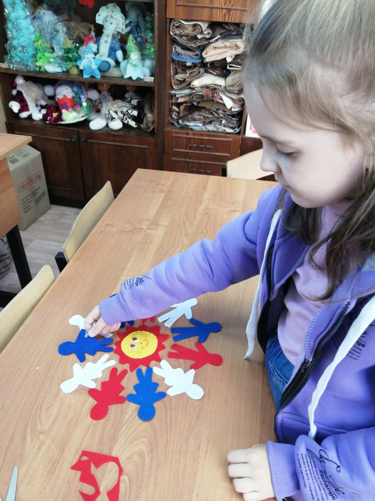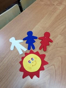 Дети сделали композицию из фетра, на ней изобразили вырезанные из фетра фигурки людей, которые держатся за руки , образуя круг, внутри круга солнце. Этой композицией мы хотели показать, что если все люди будут вместе, то можно победить любого врага и на земле всегда будет мир и будет ярко светить солнце