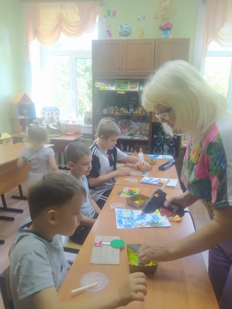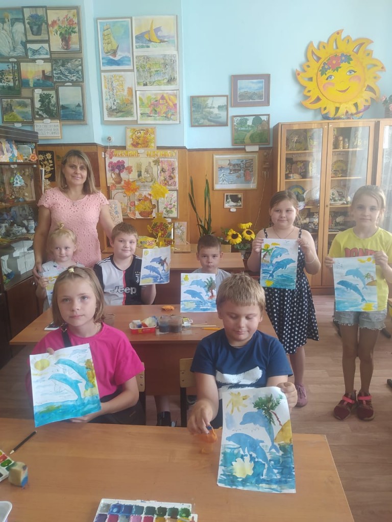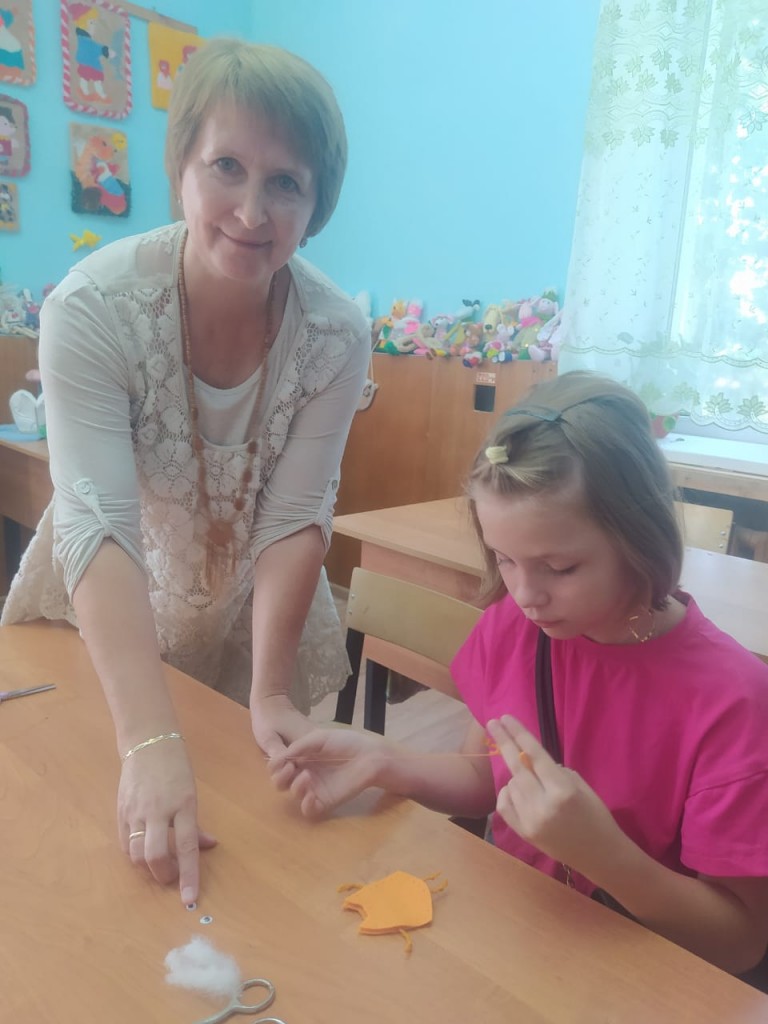 Удивительный морской пейзаж с дельфинами ребятам помогла создать, Ланчева Э.И. Оводкова И.В. познакомила с пошивом брелока из фетра, под милым названием «Котик». Вместе с Картавой Г.В., участники мастерских изготовили красивый магнитик в технике «Топиарий».