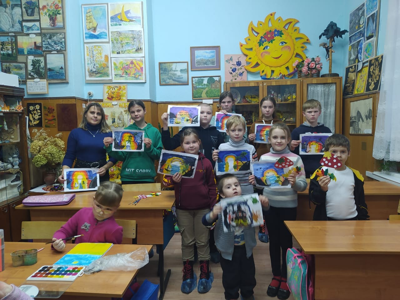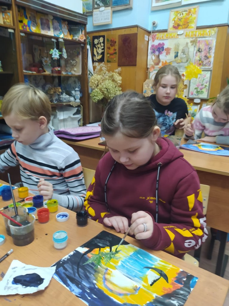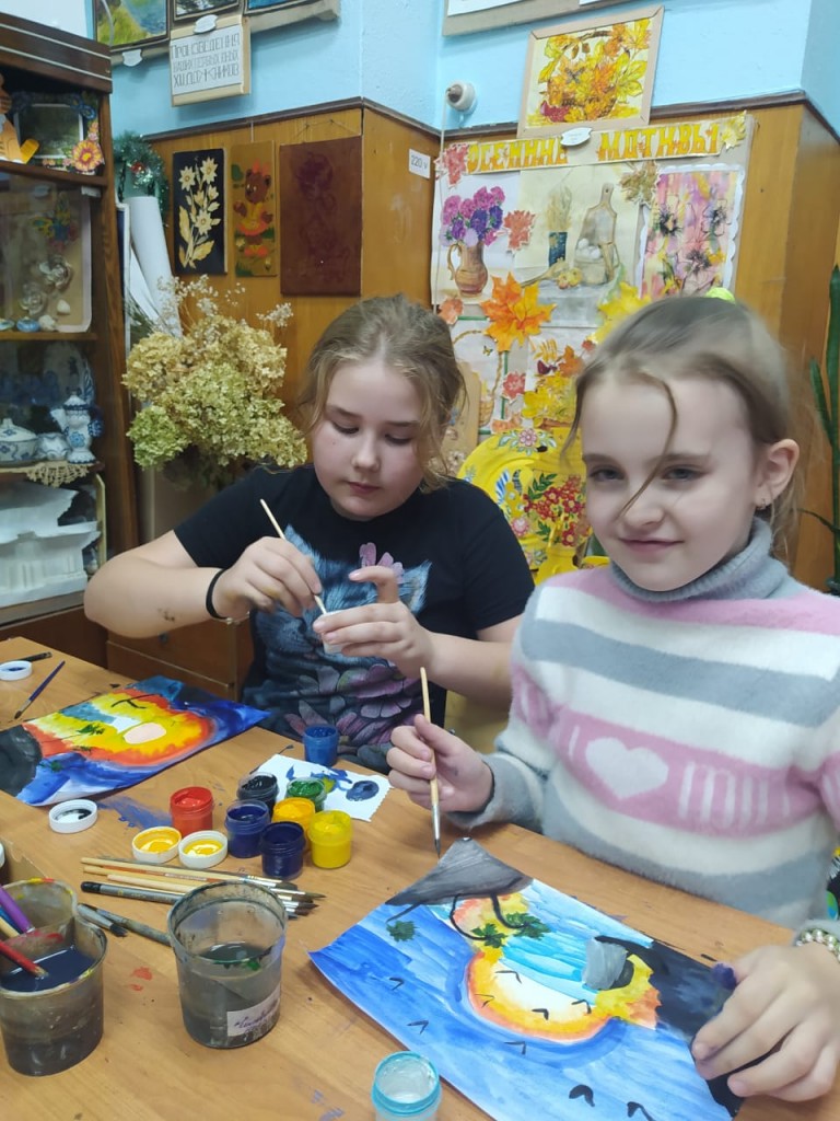 В страну изобразительного искусства ребята отправились вместе с Ланчевой Эммой Игоревной. Она предложила всем окунуться в лето, погреться на золотом песочке и проводить волшебный закат. Все с большим энтузиазмом принялись рисовать и делиться своими летними воспоминаниями.