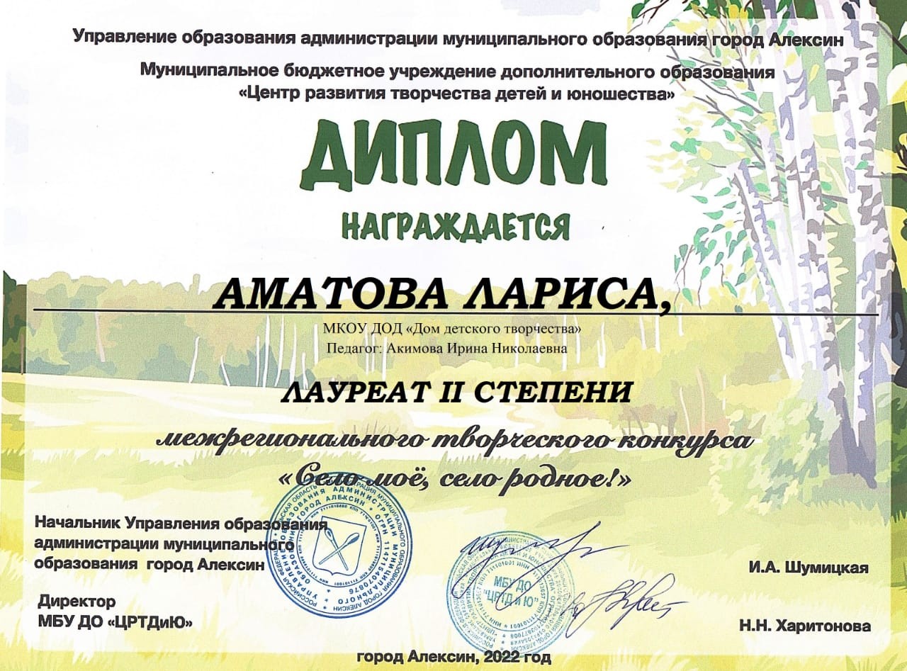 Обучающиеся под руководством педагога Акимовой И.Н. приняли участие в межрегиональном творческом конкурсе «Село моё, село родное!». Ребята стали призерами.