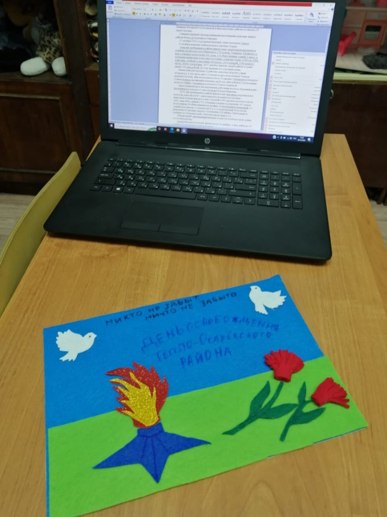 В преддверии Дня освобождения района от немецко-фашистских захватчиков, педагог Оводкова Ирина Владимировна, провела открытое тематическое занятие под трогательным названием «Никто не забыт, ничто не забыто». Рассказ о героическом прошлом жителей района, их мужестве, стойкости в борьбе с фашистами не оставил никого из участников мероприятия равнодушным . К сожалению, далеко не каждому из нас довелось знать своих прадедушек и прабабушек. Многие знают их лишь по фотографиям и по рассказам родителей. Но в нас течёт их кровь, они живы в нашей памяти. И эту память мы должны бережно хранить, ведь это и есть – бессмертие. В конце занятия, Ирина Владимировна, вместе с ребятами сделала общее панно из фетра под названием «Мы помним! Мы гордимся».