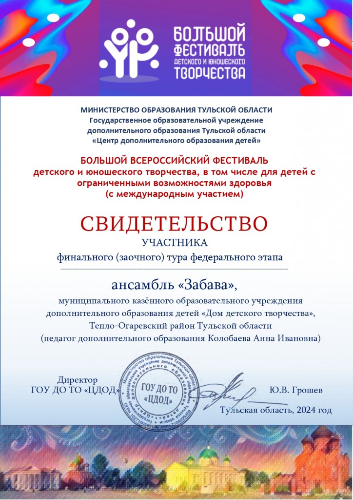 Ребята приняли участие в Большом Всероссийском фестивале детского и юношеского творчества, где достойно представили Тепло – Огаревский район. Это стало важным событием для юных талантов всей страны, включая детей с ограниченными возможностями здоровья. Фестиваль собрал творческих ребят из разных уголков России и стран ближнего зарубежья, создавая уникальную атмосферу единства и вдохновения. Ансамбль «Забава», прошёл 2 отборочных этапа, став участниками финального (заочного) тура федерального этапа.