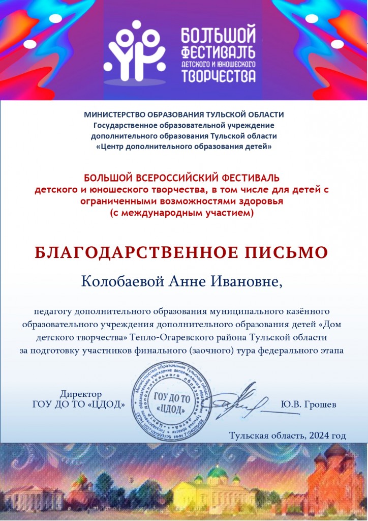 За огромный вклад в развитие детского творчества и активное участие в фестивале педагог ансамбля получил благодарственное письмо от Министерства образования Тульской области и Государственного образовательного учреждения дополнительного образования "ЦДОД". Это признание стало символом успешной работы по созданию условий для раскрытия творческого потенциала детей и подростков, а также важным шагом в поддержке инклюзивного образования и искусства в нашей стране.