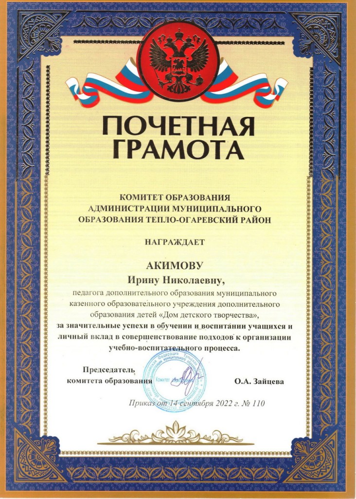 Председатель комитета образования администрации муниципального образования Тепло-Огаревский район О.А. Зайцева |