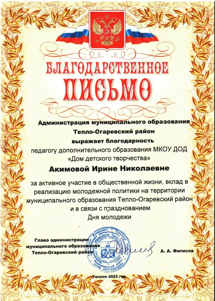 За активное участие в общественной жизни, вклад в реализацию молодежной политики на территории муниципального образования Тепло-Огаревский район и в связи с празднованием Дня молодежи |