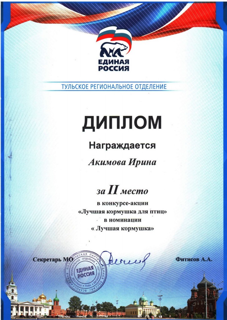 За 2 место в конкурсе-акции «Лучшая кормушка ля птиц» в номинации «Лучшая кормушка» |