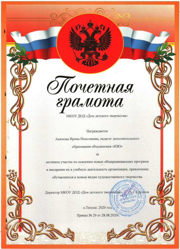 За активное участие по освоению новых общеразвивающих программ и внедрение их в учебную деятельность организации, привлечение обучающихся к новым видам художественного творчества. |