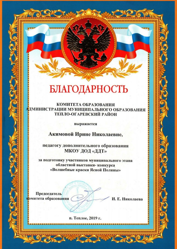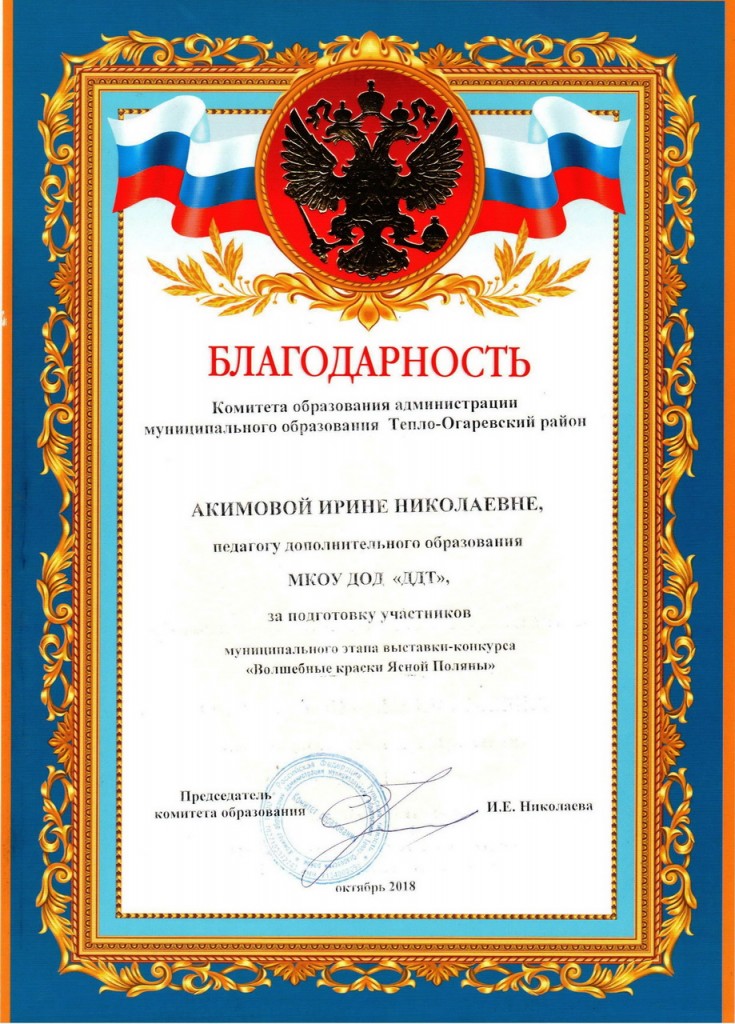 Председатель комитета образования администрации муниципального образования Тепло-Огаревский район И.Е. Николаева |